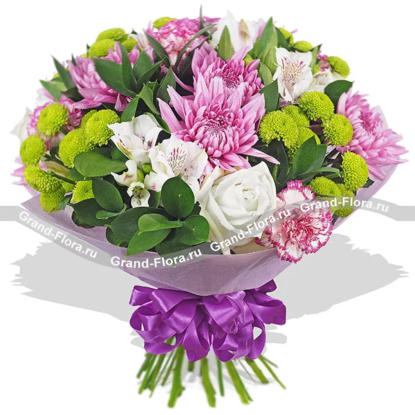 Стандартный (на фото): хризантема одноголовая фиолетовая - 5 шт., хризантема кустовая зеленая - 3 шт., альстромерия белая - 3 шт., роза белая - 3 шт., гвоздика одноголовая фиолетовая - 3 шт., рускус, фетр фиолетовый.