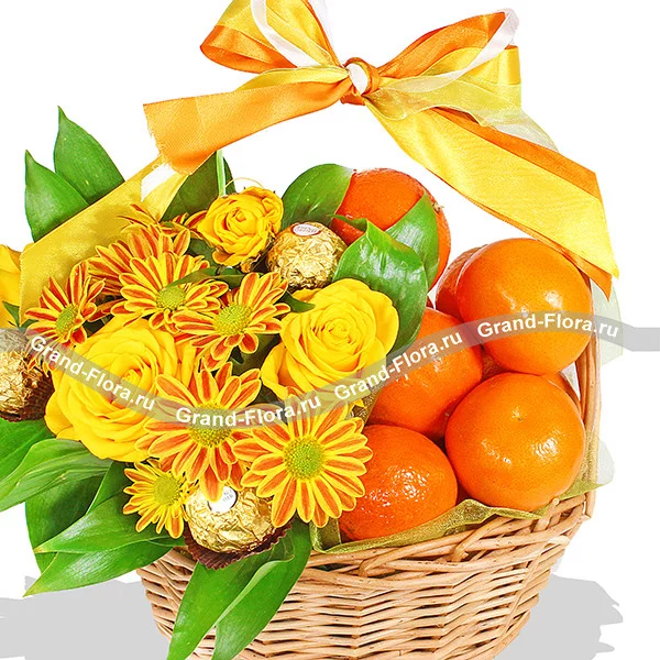 ЛЮКС: хризантема кустовая оранжевая - 5 шт, роза кустовая желтая - 4 шт, мандарины - 2 кг (возможна замена на апельсины), конфеты Ferrero Rocher, рускус, оазис, лента , корзинка.