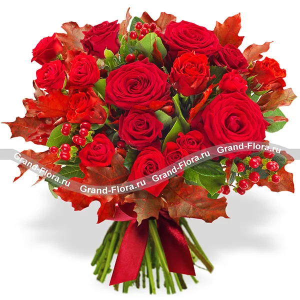 Яркий букет, составленный из насыщенно-красных роз и изящных осенних листьев. Каждый лепесток этого прекрасного букета расскажет девушке, как сильно Вы ее любите!